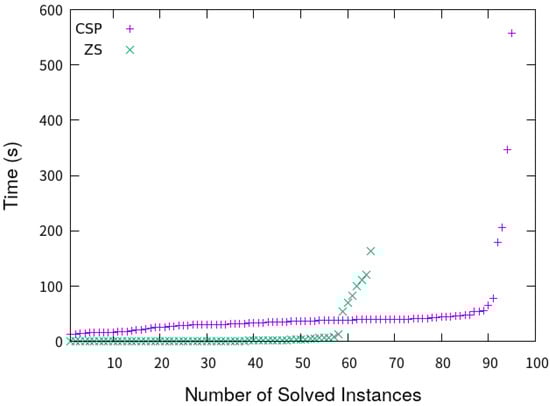 Figure 6 shows a cactus plot of running time comparison. Each point is plotted so that the x-coordinate is the number of instances solved within the time specified in the y-coordinate. The points for our method (CSP) and the generator of Zama and Sasano (ZS) are indicated with + and ×, respectively. The curve formed by the points for the same method shows an increase in the number of solved instances over time.