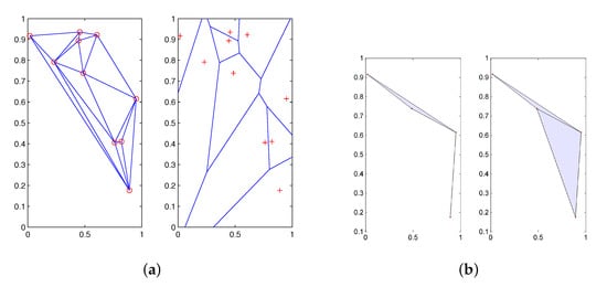 The corresponding Delaunay triangulation, , is the nerve of the Voronoi decomposition; that is, a collection forms an ℓ-simplex in if . One obtains a geometric realization of via the map . See Figure 2 for an example.