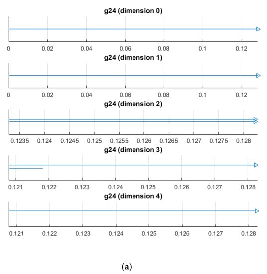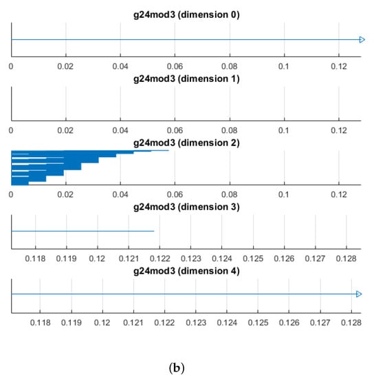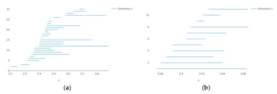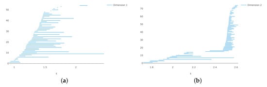 If we now sample 200 points at random on (computation time 6:54), we obtain the barcodes in Figure 9 and Figure 10. Note that we get the correct homology for .