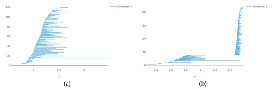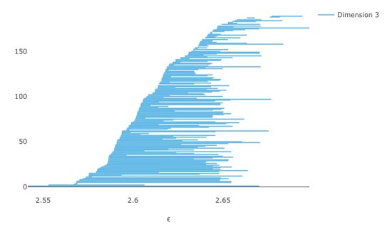 If we then generate 100 random points on this surface, we obtain the Vietoris–Rips barcodes in Figure 5. This works better than the embedding into ; we get the correct answer for . The result for 200 points is even better, and is shown in Figure 6.