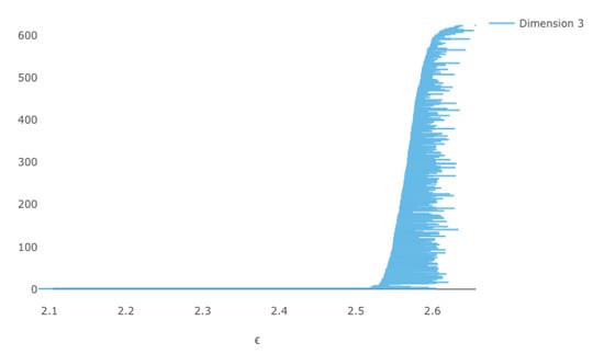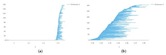 Eirene could compute homology for 200 points up to dimension 3 in about 3 min, producing a parameter value of where the homology is correct in these dimensions. It seems that is the sticking point. The barcodes for 150 points are shown in Figure 11 and Figure 12. At , the homology is correct up to dimension 3, but there.