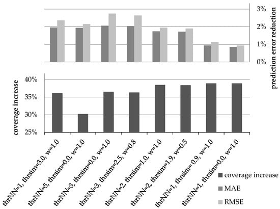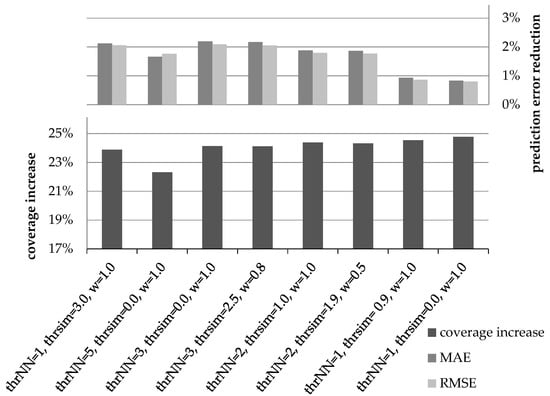The goal of the first experiment is to determine the optimal values for the parameters thrNN, thrsim, and wdr, used in the CFDR algorithm. In order to find the optimal setting for these parameters, we explored different combinations of values for them. In total, more than 30 candidate setting combinations were examined. For conciseness, our presentation is confined to the most indicative settings. For each of the parameter combinations, we present the coverage increase and the improvement of the rating prediction accuracy that were achieved (expressed as reduction to the MAE and RMSE metrics). The results were found to be relatively consistent across the seven datasets tested (for the majority of tests, the parameter value combinations were ranked in the same order across all datasets). Consequently, in this subsection, only the average values of the respective coverage increase and error metrics for the seven datasets are presented.