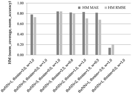 In Figure 4, we can observe that again the third setting ({thrNN = 3, thrsim = 0.0, wdr = 1.0}) attains the highest harmonic means under both error metrics (0.83 under both the MAE and RMSE), closely followed by the fourth setting (0.82 under the MAE and 0.81 under the RMSE). The fifth setting ({thrNN = 2, thrsim = 1.0, wdr = 1.0}) follows, with its HM under the MAE being 0.81 and its HM under the RMSE being 0.80.
