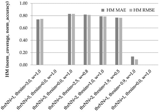 In Figure 1 and Figure 2, we can observe that prediction accuracy improvement does not present maxima and minima under the same parameter combinations. Hence, to determine the best choice regarding the optimal setting of parameters, we synthesize the coverage and accuracy metrics into a single score by computing their harmonic mean (HM). This is analogous to the combination of the precision and recall measures into the F1-measure in the information retrieval domain []. Notably, the HM is also used in other RS research works for synthesising coverage and error metrics, e.g., []. More specifically, the HM is given by the following formula: