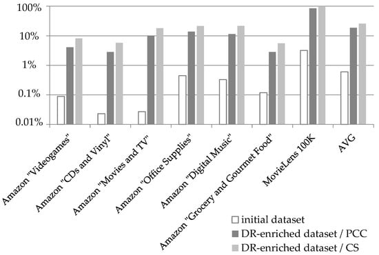 The presented algorithm was experimentally verified using seven datasets. The evaluation results showed that the introduction of the derived ratings achieved to increase the datasets density by 92 times on average, when the PCC similarity metric is applied, and by 172 times on average, when the CS similarity metric is applied, for all the datasets tested. Practically, this density increase effectively transforms the sparse CF datasets to dense, making it possible for other techniques (e.g., matrix factorization [,], a technique showing relatively poor prediction accuracy when applied to sparse datasets [,]) to be used to further improve prediction accuracy and/or recommendation quality. The proposed algorithm was also applied to a relatively dense dataset (the MovieLens 100 K, whose initial density was 3.17%) and has also been found to successfully increase both its density and coverage further, leading to additional improvement in the rating prediction accuracy. This indicates that the algorithm can be employed across all datasets, regardless of their densities. Hence, a CF system implementation may employ the proposed algorithm, without even examining the properties of the used dataset.