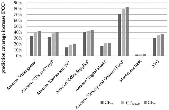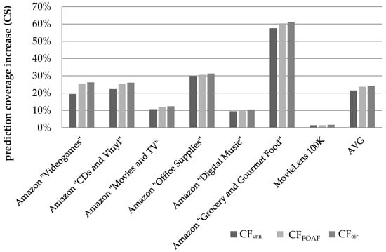 Moreover, the CFDR algorithm, was also compared with (a) the CFVNN algorithm introduced in [], where artificial user profiles (Virtual Near Neighbours—VNNs) are created by merging pairs of NN profiles corresponding to real users, and (b) the CFFOAF algorithm introduced in [], where two users can be considered as NNs with each other if they are NNs to a third user. Both of these algorithms contribute to the “grey sheep” problem alleviation. The CFDR algorithm was found to consistently outperform both the CFVNN and the CFFOAF algorithms in all tested datasets and under both similarity metrics, for both rating prediction accuracy and coverage. A comparison was also made against state-of-the-art algorithms aiming to increase rating prediction coverage utilizing only the user–item rating matrix and has been shown to outperform all of them by a considerable performance margin.