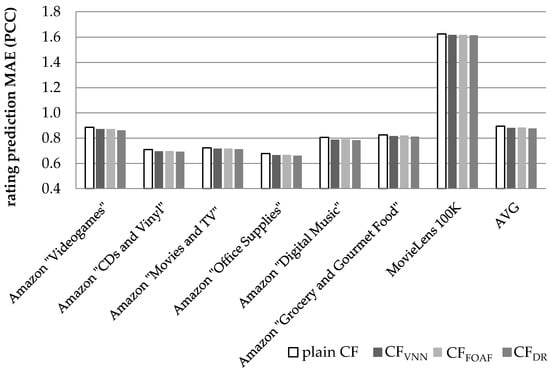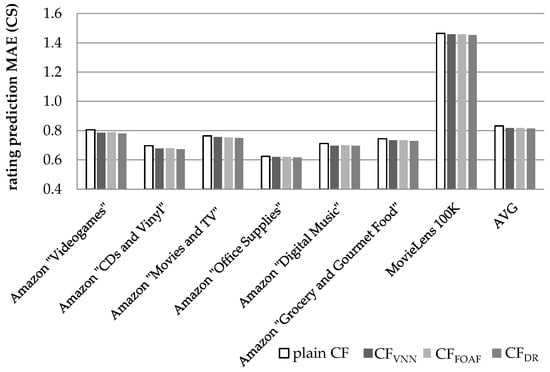 Rating prediction MAE for the datasets summarized in Table 4, when the CS user similarity metric is used.