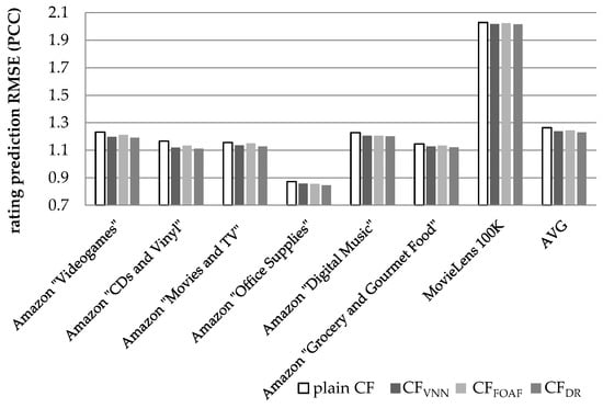 In Figure 11, we notice that the CFDR algorithm, presented in this paper, achieves an average prediction RMSE reduction equal to 2.09% (in absolute terms 1.151 versus 1.176, the plain CF achieves), exceeding the performance of the CFVNN algorithm [] (which is measured at 1.48%) by 0.61% in absolute figures or by 41.5% as a relative improvement. The CFDR algorithm also outperforms the CFFOAF algorithm [], whose performance is measured at 1.47%, by 42.2%. On the individual dataset level, the performance edge of the proposed algorithm against the CFVNN algorithm ranges from 8.95% (for the Amazon “Digital Music” dataset) to 87.5% (for the Amazon “Grocery and Gourmet Food” dataset).
