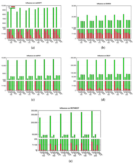 Comparisons of Influence Spreading with , T = 100 and U size = 200