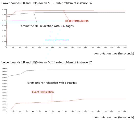 For the easier instance B6, lower bounds are always better than lower bounds. This situation will continue until the curves converge to the optimal values of and . For the more difficult instance B7, the lower bounds are always better than lower bounds, which seems paradoxical as in the convergence state we have with Proposition 1. Considering reasonable computational times for our application, it is more efficient to use formulation to compute partial lower bounds or the most difficult instances. For many instances, dual heuristics are better than with the LP+cuts stopping criterion, as shown in Table 10. Having smaller MILPs with , more efficient cuts are generated, and it is decisive for the dual bound quality with LP+cuts computations. Good primal solutions generally plan four or five outages for each T2 unit. Hence, a 6th outage induces more costs as T2 production is cheaper than T1 production. It explains that dual bounds are good approximations, and the major approximation is due to the approximation of the penalization costs fore the remaining fuel. The possibility to have a 6th outage induces more binaries and continuous variables, which is highly penalizing for the cutting planes generation and MILP solving capacities of dual bounds. For instances B10, X12, and X14, the LP+cuts dual bounds are better with and allowing branching allows for having better dual bounds with relaxation.