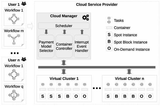 Figure 1 shows the proposed system for building reliable virtual cluster execution environments. In this scenario, users submit their workflows to the cloud service provider (CSP) and specify the budget limit and deadline based on the workflow’s longest task. The CSP reserves the necessary resources, in the form of VM instances, from the cloud infrastructure to execute workflow applications with budget and deadline constraints. Instances differ in type (t2.small, etc.) and pricing model (e.g., on-demand, spot block, and spot instances). Workflow deadlines become activated right after submission. The CSP implements four main modules: (a) scheduler module; (b) payment model selector module; (c) container controller module; and (d) interrupt event handler module. The scheduler module has no knowledge of when workflow applications arrive. It decomposes users’ workflow applications into a set of tasks and runs the resource allocation algorithm that creates task-to-instance mappings. This module interacts with all the other three, receiving monitoring information and managing the virtual cluster execution environments. The payment model selector gives instructions on behalf of scheduler about the instance model to choose to execute a specific task. It is the responsibility of the container controller module to launch and manage containers on top of VM instances over which tasks will execute. A container has full access to its VM resources. The set of containers will form the user’s virtual cluster executing environment. The interrupt event handler module is in charge of monitoring spot interruption events and of informing the scheduler module to find another instance to which the container executing the task will be migrated. It is also the interrupt event handler module’s duty to monitor the spot request fulfillments. The objective is to mitigate the unreliable nature of SIs, and control spot request fulfillments. A container encapsulates the task execution environment and is the unit of migration in the system. Each container runs a single task and can be multiplexed among various tasks over time as one task finishes executing and another one is ready to start.