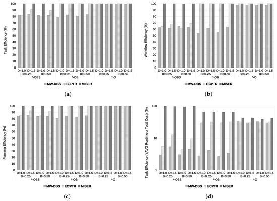 The planning efficiency is shown in Figure 2c. Here, the objective was to analyze the success rate of finding a valid schedule map for each workflow task in the scenario considering deadline and budget constraints. MISER proved to be stable in finding task-to-instance mappings, successfully scheduling 100% of the tasks for all considered budget and deadline constraints, and for all possible *-OBS, *-OB, and *-O configurations. What is more, MISER-OBS outperformed MW-DBS-OBS and ECPTR-OBS by as much as 16.3% and 15.6%, respectively. The ECPTR-O* performances fell from 100% of planning efficiency to 84.4% for *-OBS ( and ). Here, the same pattern was observed: ECPTR performance (a) improved with increasing deadline; and (b) beat the performance of MW-DBS for high deadlines. In turn, adopting a scheduler that does not consider the nature of different instance purchasing models, as is the case of MW-DBS, leads to a planning success rate that can be as low as 83.7%, 80.8%, or 99.3 for *-OBS, *-OB, and *-O configurations, respectively.
