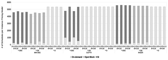 This section presents the results and analysis of the performance of the proposed solution. A set of 5370 workflow tasks were submitted, contained in 190 workflows, and distributed by 25 users. In the figures, B and D are the parameters introduced by Equations (13) and (14), respectively, to create several budget and deadline constraints. In turn, *-OBS, *-OB, and *-O mean that algorithms used that instance pricing models to schedule tasks (i.e., O—on-demand, B—spot block, S—SIs). For example, MW-DBS-OB means that the MW-DBS algorithm considered cumulatively on-demand and spot block instances to schedule the tasks. Unlike MISER and ECPTR, MW-DBS is agnostic regarding reliability of SIs. ECPTR-O and ECPTR-OB report the same results on every figure because the algorithm is confined to allocate tasks in on-demand and SIs instances only.