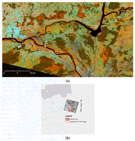 Testing scene of RS algorithm: (a) part of Landsat ETM+ satellite image (ID = LE71880232000128EDC00); Red-Green-Blue (RGB) composition of bands (4, 5, 3). (b) Landsat ETM+ whole satellite image and testing scene (red)—location in Poland.