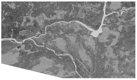 The source was part of Landsat ETM+ scene [83]. The basic parameters of the image are available as a metadata file separately. The only correction concerned spatial resolution of panchromatic band No 9 (generalization of spatial resolution from 15 to 30 m). There were nine spectral bands. They were numbered 1 to 9 (as the k parameter for the RS algorithm). The spectral resolution was left intact.