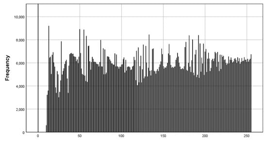 That is why the original resulting image was rescaled into the range <0, 255>, rounding off the values to the nearest lower positive integer (again using the raster calculator). The flattened histogram, i.e., the greyscale values, are presented in Figure 3 and spatially visualized in Figure 4.