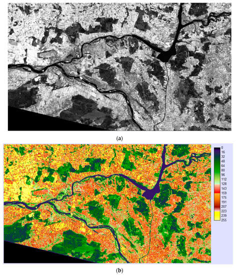 (a) Visualization of a single band, greyscale image of the transformed and rescaled outcome of the RS algorithm application on an original Landsat ETM+ satellite image, involving information from all nine spectral band components. (b) Visualization of single band, pseudo-color, 256 classes of transformed and rescaled image, outcome of the RS algorithm application, involving information from all nine spectral bands components.