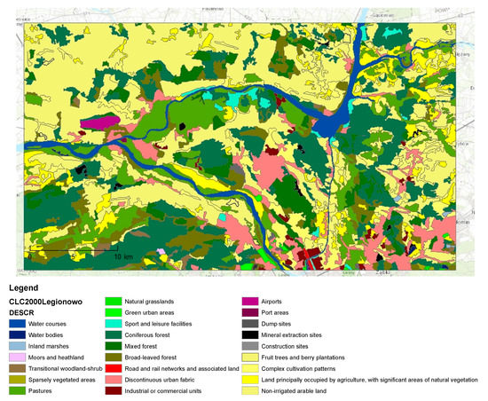The testing scene was chosen because the area had been studied and classified in detail twice before. The first was a visual interpretation of the images taken by the Landsat TM satellite, according to the uniform European CLC legend based on a study carried at the Institute of Geodesy and Cartography (2000, shared by the Polish Main Inspectorate of Environmental Protection) [82]. Second, a similar (but smaller) area was also the topic of a research project aimed at object-oriented classification to obtain information on land cover and land use [2] at the same time. The scene and the same year were intentionally selected and the same satellite image was used to check the usefulness of the procedure for the preparation of input data fusion. The map tile also covers an area not covered by the image in the south–west (left corner of image).