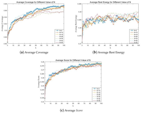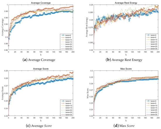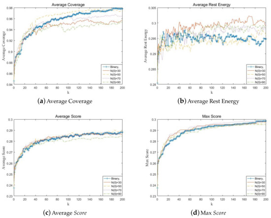 Figure 7a shows the influence of on the objective of coverage. When is too low, the optimization speed and final results of coverage are poor, the algorithm may fall into local optimum. Figure 7b shows has little influence on the objective of rest energy. Figure 7c,d show that considering the two optimization objectives comprehensively, should be chosen over 10.