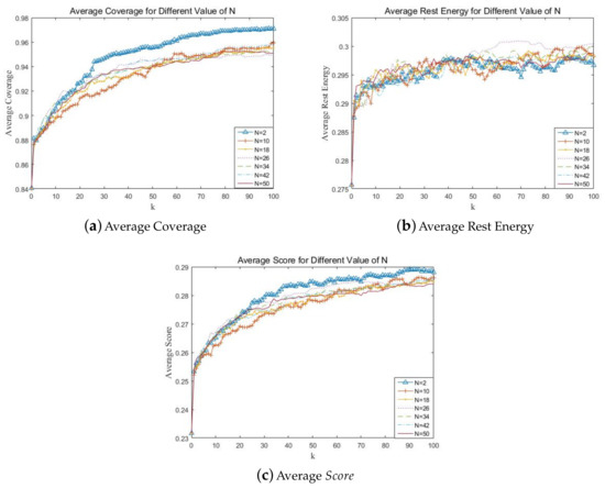 The influences of ary number N for two different random node placements are shown in Figure 2 and Figure 3. Each figure is composed of (a), (b) and (c), respectively, corresponding to three evaluation indexes, average Coverage, average Rest Energy, and average .