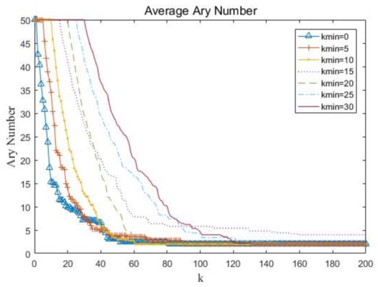The highest ary number’s generation is used to set the generation of the initial ary number needed to remain. The value of the determines from which generation the ary number begins to decline adaptively. If is too low, the algorithm is easy to fall into a locally optimal solution. If is too high, the algorithm will need to spend much more time. Therefore, the selection of an appropriate highest ary number’s generation is very important.