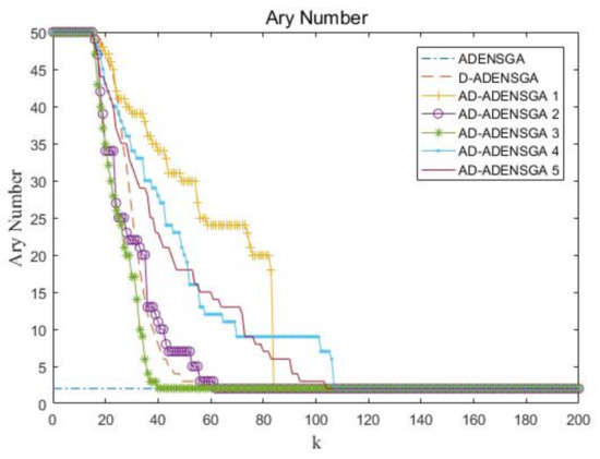 The curves of ary number changing with the generation are shown in Figure 9. The curves respectively represent the change of ary number for AD-ADENSGA in five runs, ADENSGA and D-ADENSGA.