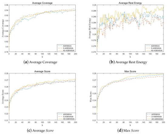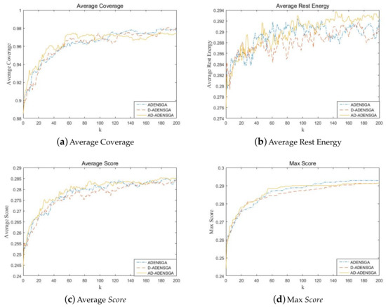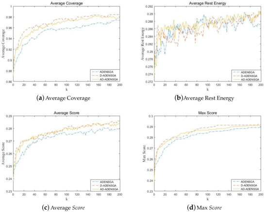 Figure 10 shows the results of ADENSGA, D-ADENSGA and AD-ADENSGA in each generation. Among them, Figure 10a shows the average Coverage curves, Figure 10b shows the average Rest Energy curves, Figure 10c shows the average curves and Figure 10d shows the max curves. The average Coverage curves, average Rest Energy curves and average curves respectively represent the average of the mean value of the first dominance level’s Coverage, Rest Energy and in five runs. The max curves represent the average of the maximum value of the first dominance level’s in five runs.