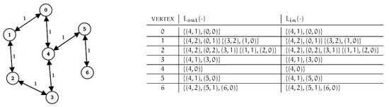 A naive approach to compute a 2-hop-cover labeling of a graph consists of executing twice a shortest-path algorithm that can be a Breadth First Search (BFS) in unweighted graphs or the Dijkstra’s algorithm in weighted ones, using as root each vertex , once forward (that is, in G), and once backward (that is, in ). In the forward case, when a vertex u is extracted from the queue, used by the shortest-path algorithm, with a priority of d, that is when a shortest path with weight d from the root v to u in G is found, then entry is added to . In the backward case, instead, entry is added to whenever vertex u is extracted from the queue and hence when a shortest path, with weight d, from the root v to u in , is found.