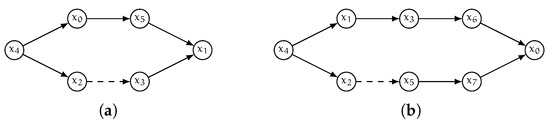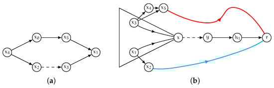 In other words, analogously to the forward case, vertices of the backward cover graph are those having, in G, a shortest path from x that might contain arc and hence whose distance from x might change as a consequence of a decremental operation occurring on . Please note that again whether the distance from x changes or not depends on the number of shortest paths from the vertex from x that are in the graph, and on the vertex ordering. Note also that the arcs of such graph are the arcs of a shortest-path arborescence of rooted at y plus arc (a toy example of the structure of cover graphs for a given input graph is shown in Figure 3b).