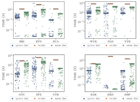 At the end of the k updates, statistic measures of central tendency and dispersion (e.g., mean, median, interquartile range, standard deviation) are computed for all observed performance indicators. The results of our experimentation are summarized in Table 2, where we compare the running time of queue–2hc against that of bidir–2hc and fs–2hc, respectively, by showing both mean and median values, as central tendency measures. Dispersion of (some of) the samples is shown through the scatterplots of Figure 7 where we report all observed values of running time for a meaningful subset of the tested inputs. Please note that we omit the measures of average labeling size and average query times, since they are essentially identical for the three computed labelings (that recomputed from scratch and the two obtained via dynamic algorithms). This is expected by the theoretical results, since both the dynamic algorithms and fs–2hc produce minimal labelings (small, negligible variations are observed due to ties in the vertex ordering, which are broken arbitrarily). Notice also that our choice of considering randomly selected updates is dictated by the fact that unfortunately, datasets containing real-world graphs with real-world sequences of decremental updates are not so easy to find in publicly available repositories. However, we employed quite large sequences of updates and this is considered rather effective in capturing the typical performance of this kind of algorithms, as well documented in the literature [42,43]. Clearly, the larger the size of the sequences, the better is with respect to variance in the observed results. To the purpose, in our case, the value of k is selected so to obtained observed average running times that are quite stable between different runs considering different sequences.