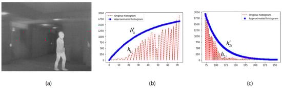 This process is explained more explicitly in Figure 1. Figure 1a shows an infrared image of the person walking and Figure 1b shows the histogram of the corresponding infrared image. In Figure 1b, we can see that the whole histogram is portioned into two parts based on the value of . The first part of the histogram is labeled by and the second part of the histogram is labeled by .