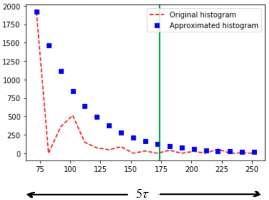 where is analogous to the initial time, is analogous to the initial response and is analogous to the final response. Figure 2b shows the approximated histogram corresponding to the second part of the original histogram shown in Figure 1b. We observe that the second part of the histogram contains grayscale frequencies of two categories such as zero grayscale frequencies and non-zero grayscale frequencies as shown in Figure 2b. For the zero grayscale frequencies category, the number of pixels associated with either background or foreground (objects) is zero. This means that no significant information exists at the grayscale values corresponding to the zero grayscale frequencies, whereas the non-zero-grayscale frequency represents the number of pixels associated with either background or foreground (objects) in the grayscale image. The second part of the approximated histogram follows the original histogram at the non-zero grayscale frequencies. As shown in Figure 2b, the approximated histogram exhibits a close resemblance to the original histogram of the infrared image at the non-zero grayscale frequencies and we can see that the resemblance was even closer at the intensity values corresponding to the foreground (object) of the infrared image, and this step of the tracing is considered as an important event in the proposed method. Based on the value of , the approximation histogram of the image can be expressed as
