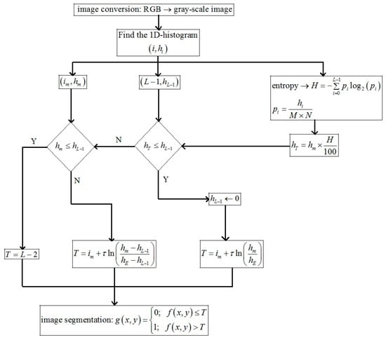 In intensity thresholding, the gray-level is compared with a threshold value and based on the comparison, the grayscale image is converted into a binary image []. Equation (18) gives the expression of the threshold value for the image segmentation. Based on the threshold value, the image can be converted into a binary image as