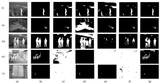 The experiments were conducted on all the images of the databases listed in Table 2. A sample image from each sequence was considered to exhibit the thresholding results of our method along with other state-of-the-art methods as shown in Figure 5. To evaluate the performance of the proposed methods, the results of our method were compared with the ground truth images shown in Figure 5b and other image thresholding methods. Figure 5c shows the thresholding results of the Yen method, Figure 5d shows the thresholding results of the Soundrapandiyan et al. method, Figure 5e shows the thresholding results of the Milad et al. method, Figure 5f shows the thresholding results of the Tao et al. method and Figure 5g shows the thresholding results of the proposed method. Although most of the results of the various methods are very close to the ground truth images, we can observe severe over-segmentation or under-segmentation in some of the results. We considered such severely over-segmented or under-segmented results to be poor performance results. The Yen method has produced poor results for Figure 5iv,v; this reveals the inconsistency of this method in the thresholding of infrared images captured under different conditions. Soundrapandiyan et al. has produced poor results for Figure 5ii,iv,v, and Milad et al. has produced poor results for Figure 5iii,iv,v. Although the two methods were developed for infrared image segmentation, the results of these methods show incompetence in thresholding infrared images, especially in the case of multi-object infrared images. Although the Tao et al. method produced satisfactory thresholding results for the first three images, this method produced over-segmented results for the next two images. It can be observed from the thresholding results that the proposed method yields consistent and satisfactory segmentation for all the images. Even though the proposed method produced better results compared to other methods, our method lags in providing more accurate results for high-resolution infrared thermal images, which we can observe in Figure 5iv,f. The proposed method is successful in thresholding single person as well as multi-person infrared thermal images, which shows the significance of our method for the purpose of person detection applications. The proposed method produced more accurate thresholding results in case of detecting hotspots in the solar PV panels, showing the effectiveness of the proposed method in real-world applications. In more detail, the performance of the proposed method was evaluated via quantitative analysis.