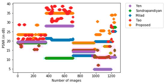 Sequences named as ‘hiding’, ‘horse’, ‘mixed-distractors’, and ‘saturated’ in the LTIR dataset are the first four sequences and the image set in the Photovoltaic System Thermal Image Database is labeled as sequence 5. These five sequences are considered to evaluate the performance of the proposed method and the average peak signal noise ratio (PSNR) values obtained for each sequence are listed in Table 3. The performance comparison based on PSNR values obtained for the images in all sequences (total of 1249 images) is shown in Figure 6.