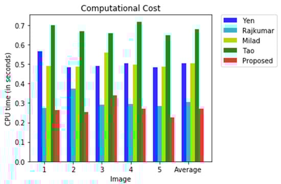In order to assess the computational cost [], the CPU times were measured for the images shown in Figure 5. A list of the CPU times for each method is provided in Table 4 and Figure 7. From this table, we can observe that the computational cost is high for the Yen method, Milad et al. method, and the Tao et al. method. The reason for this is the number of iterations required in these methods to generate an optimal threshold value, whereas the computational cost is less for the Soundrapandiyan et al. and the proposed method. The Soundrapandiyan et al. method requires the background subtraction of the image, which is an additional step compared to the proposed method, and this additional step causes a higher computational cost than the proposed method. The simple mathematical structure of the proposed method to produce the optimal threshold value causes the lowest computational cost of all the methods listed in Table 4.