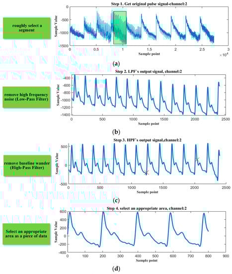 In our previous work [], a pulse signal acquisition system was designed to collect the wrist pulse waves. MEMS sensor is employed to transforms the pressure signal into a voltage signal, and an array composed of 12 such sensors outputs 12 differential signals. Operational amplifiers magnify the signals, which are polled by a multiplexer (MUX). Then the MUX’s output signal is sampled by an analog-digital converter (ADC), transformed into a digital signal, transmitted to PC, and stored into the disk. The sampling frequency for each channel signal is 218 Hz, much higher than the pulse signal.