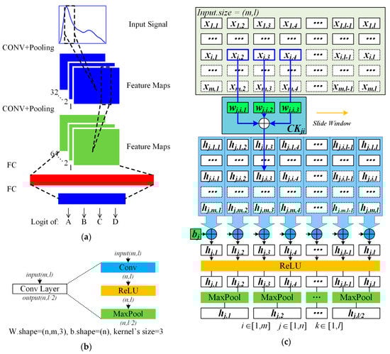 Figure 4a shows a CNN model, which contains two types of layers, the convolution (CONV) layers, and the fully connected (FC) layers. CONV layer refers to 3 operation types: convolution, activation, and pooling separately, as shown in Figure 4b. The input tensor has channels of features, and the length of each channel is . The CONV layer’s computational procedures for an output channel are shown in Figure 4c. For each output channel , each input channel is processed by a corresponding sliding window, which is also named convolution kernel. Then the convolution results of input channels are accumulated, processed by a rectified linear unit (ReLU), then pooled by a maximum function. After the CONV layers, the feature maps are flattened to a 1-D tensor, which is the input tensor of the FC layer. The FC layer’s computational function is