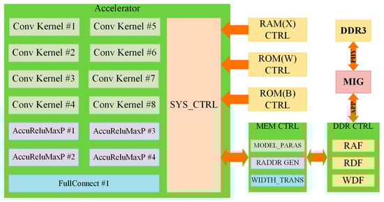 In the hardware system, the accelerator is composed of three parts: the computation modules, the control modules, and the memory modules. The system architecture is shown in Figure 5. According to the description in Section 2.3, a CONV layer has three operation modules: CK and accumulator, ReLU, and maximum pooling. Owing to the substantial data dependence between the accumulator’s input and the convolution kernel’s output, we divide the two operations. We use CK modules to realize the convolution procedure and ARMP modules to process the rest computation part of the convolution layer. Moreover, we perform the FC layer using a FC module. The entire system has eight CK modules, four ARMP modules, and one FC module, which are all pipelined to accelerate the arithmetic speed.