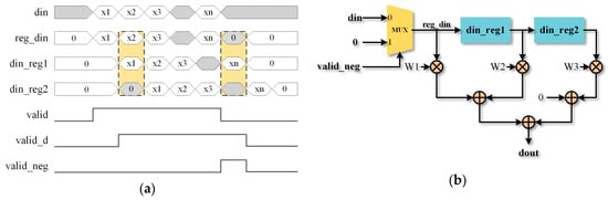 The CK module is the computation-intense part of the system, which is pipelined to advance the operation speed. In the CNN software algorithm, we need to pad 0 before and after the input tensor. The RTL circuit design is shown in Figure 6. Only when the valid signal of input is high, will the input be selected as the value to participate in the calculation. While detecting the valid signal’s negative edge, the value 0, not the input will be transmitted into reg_din.