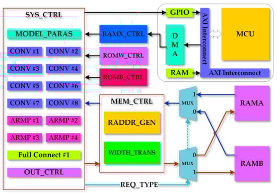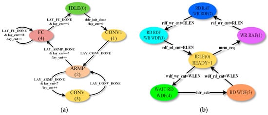 The controller design is mainly based on the finite state machine (FSM). When the start signal is triggered, the FSM begins to calculate. The input of the first CONV layer, which is marked as CONV1, is from a random-access memory (marked as RAMX), while the inputs of other CONV layers are from DDR. The principle of the SYS_CTRL module is shown in Figure 7a. The system first runs the convolution step of CONV1, performs its ARMP operation, and executes CONV and ARMP layer by layer. When all convolution layers are handled thoroughly, the SYS_CTRL starts to calculate the FC layers. Finally, output the result when FC layers are finished.