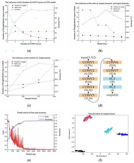 CNN network model design and parameter reduction. (a) The effects of the number of CONV layers on CNN model. (b) The effects of the ratio of output channels and input channels. (c) The effects of the number of sample points of input tensor. (d) The CNN model which has relative high accuracy, less required buffer size, and a few parameters. (e) The trend curves of loss and accuracy during training. (f) Visualization of FC1’s output tensor.