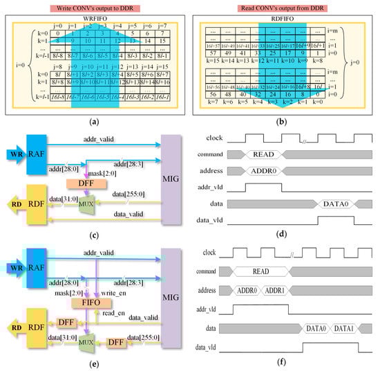 Memory access module design and optimization. (a) Write CONV’s output to DDR. (b) Read CONV’s output from DDR. (c) Usual solution to discrete read address. (d) Timing diagram of usual solution to discrete read address. (e) Optimized solution to discrete read address. (f) Timing diagram of optimized solution to discrete read address.
