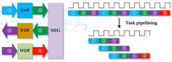 To further improve the performance of the accelerator, we analyze the memory access mechanism. According to the description in Section 2.4.3, the operation procedures of memory access are writing RAF (marked as task 1), reading RAF and writing RDF (marked as task 2), reading RDF and writing WDF (marked as task 3), and writing DDR (marked as task 4) eventually. The scheme is shown in Figure 10, where the arrows mean the data stream’s flow direction. However, the interval between two adjacent data streams cannot be neglected, which adds unnecessary latency in the whole process.