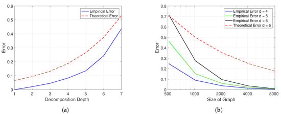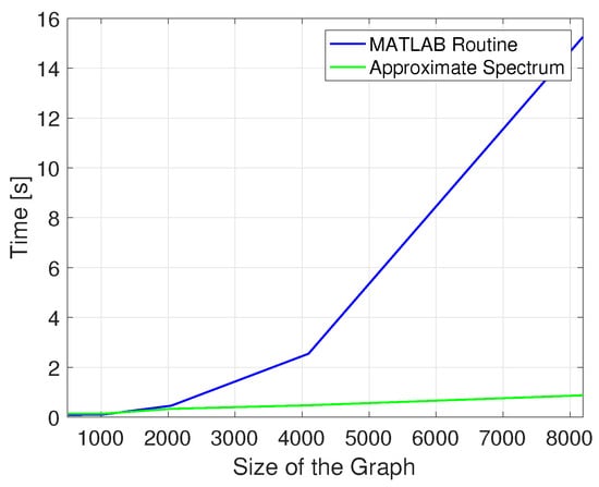 These results provide the following two insights. First, for large-size graphs the approximation is tight, i.e., it vanishes as n grows. Hence, the proposed method is asymptotically efficient in the size of the graph. Second, the time complexity of the method is bounded below by the so-desired complexity, and above by the (naive) cubic complexity, . Therefore, as pointed out in Corollary 2, a good compromise between the decay rate of the error and complexity can be achieved when we fix to .