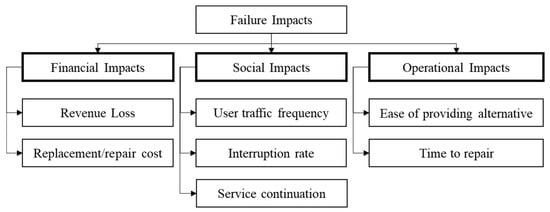 Indirect impacts of failure in subway stations include numerous attributes such as service disruption, delay of passengers, reputation loss, and revenue deficit, in addition to other socio-economic impacts. Therefore, determining failure impacts is crucial because it provides public authorities with a framework for clustering network components based on their relative importance. The triple bottom line approach is used to determine failure impacts on a multi-perspective level. A station is composed of a number of elements operating simultaneously. Based on the location of the element and its nature, the element failure might cause total, partial, or no station closure. This suggests failure impacts are element-dependent, hence, the failure impacts module is developed on elements level and aggregated upwards to the stations and network levels of a subway hierarchy using the parallel-series network modeling approach. Based on literature review and expert feedback, failure impacts were grouped into financial, social, and, operational impacts. It is noted that some factors are independent and follow two different perspectives simultaneously. Figure 1 demonstrates the main criteria and attributes considered in the failure impacts module. Financial impacts of failure represent the direct tangible impacts measured in terms of cost of maintenance, repair, or replacement of the failed component(s). This is in addition to the expected revenue loss due to partial or total station failure or service interruption. Operational impacts are those involving managerial decisions, such as time to repair and ease of providing alternative. Social impacts are the direct social failure impacts incurred by the customers. They are measured in terms of the user traffic frequency, interruption rate, and service continuation. The magnitude of the social impacts is directly proportional to the number of users using this station and the adjacent businesses to which the station connects.