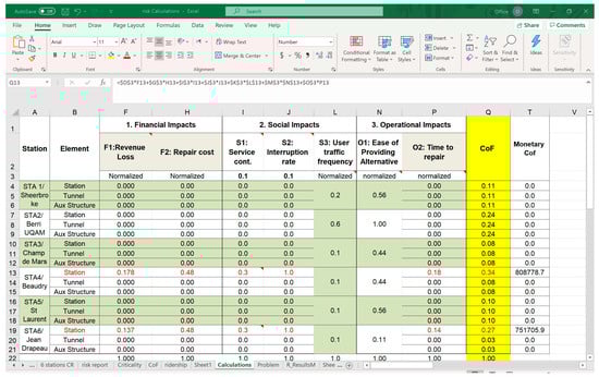 The failure impacts module follows three main steps to calculate the CoF score per subway element. Sample screenshot for the calculation sheet is shown in Figure 2. In the financial impacts cluster, the expected revenue loss is identified per element and then normalized based upon the maximum value available for the network under study. Repair cost score is calculated based upon the repair option selected and normalized to the maximum score which is the replacement option. These steps are repeated for the social and operational impacts of failure. Using the weights obtained from FANP calculations, the impact value per element is calculated as seen in the last highlighted column (CoF).