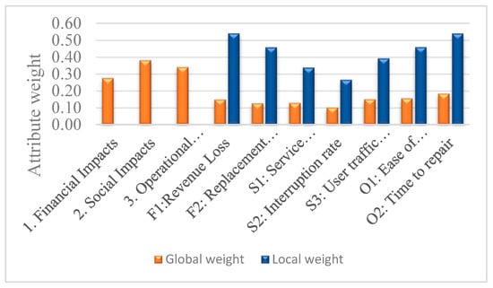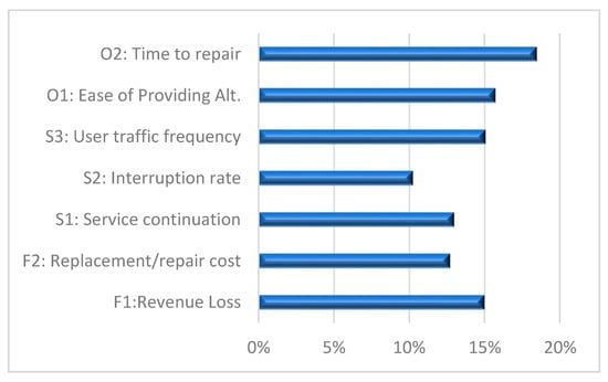Attributes and criteria weights are shown graphically in Figure 3 and Figure 4, time to repair had the highest global weight of 18.45%. This is understandable since time to repair has direct impact on revenue loss, interruption rate, and the user traffic frequency. Ease of providing alternative and user traffic frequency came next with close global weight values of 15.69% and 15.04%, respectively. Both sub-attributes are seen as interrelated, since a decent alternative ensures customers are minimally affected by the service interruption. Revenue loss has a global weight of 14.96%, based on experts’ feedback; operational costs are usually used to cover moderate to low financial impacts of failure, and this explains the somehow moderate global weight of the revenue loss. Replacement/repair cost and service continuation are next, with close global weights, followed by interruption rate having the least weight of 10.22%.