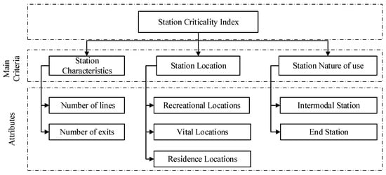 Station characteristics is defined in terms of number of lines and number of exits per station. Station location is considered to account for increased stations’ criticality due to their proximity to important location, where the service is more required and the frequency of passengers is higher (e.g., hospitals, recreational areas, and universities). A binary value is assigned per station per location; in addition, a combined location option is permitted, and hence, a station can have value in all location attributes. Station nature of use account for station importance derived from its function as an end station or an intermodal station. The attributes and sub-attributes considered in the criticality index model are summarized in Table 9. The attribute scores are computed based upon the network under examination and individual station information. The scores are obtained as shown in Table 10.