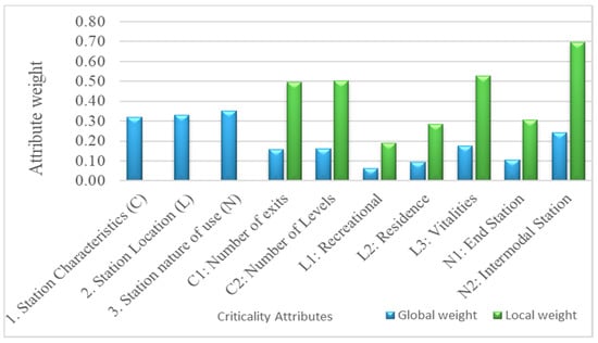 The third section of the questionnaire presents questions for rating criticality attributes with respect to their importance. Pairwise comparison matrices from the questionnaires are processed in MATLAB® to obtain local and global weights for attributes using FANP with application to FPP. The FANP MATLAB® code was used for the criticality index calculations following the same steps listed earlier. Local and global attributes weights are presented in Table 12. The three main criteria comprising the model had close weight values ranging from 31.82% to a maximum of 35% for station location. Attribute scores, on the other hand, show great variability in terms of global weight as shown in Figure 7 and Figure 8. An intermodal station has the highest global weight of 24.37%. This is expected since an intermodal station presents an intersecting number of lines and/or transportation modes which implies higher traffic frequency and consequently higher station importance.